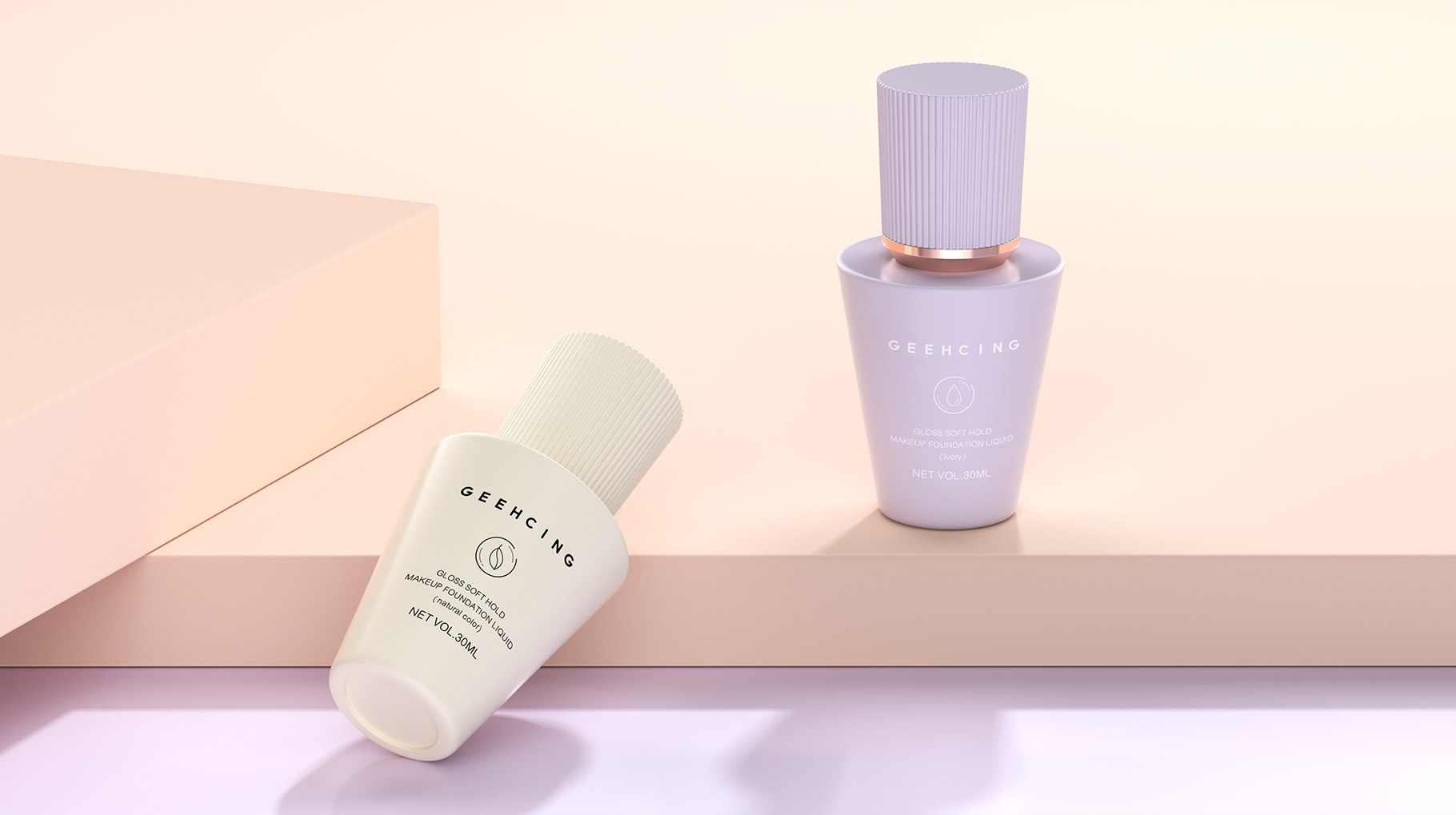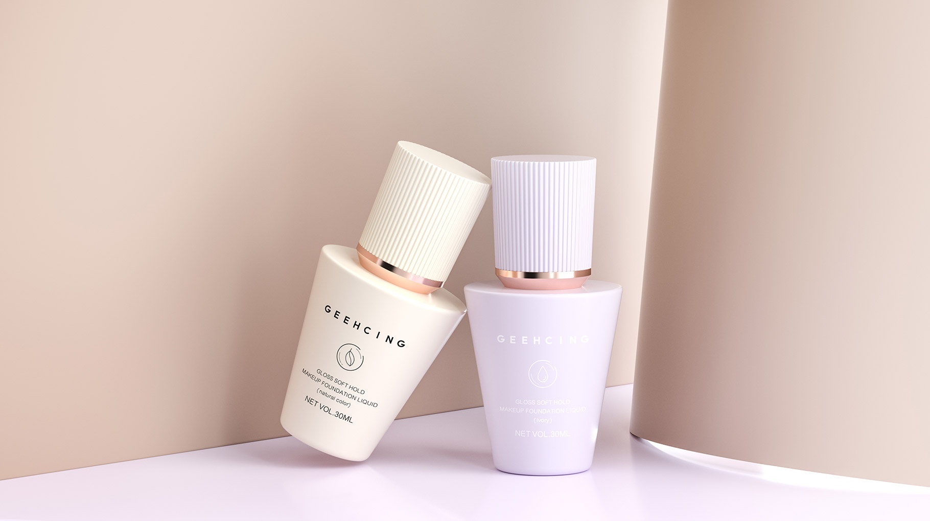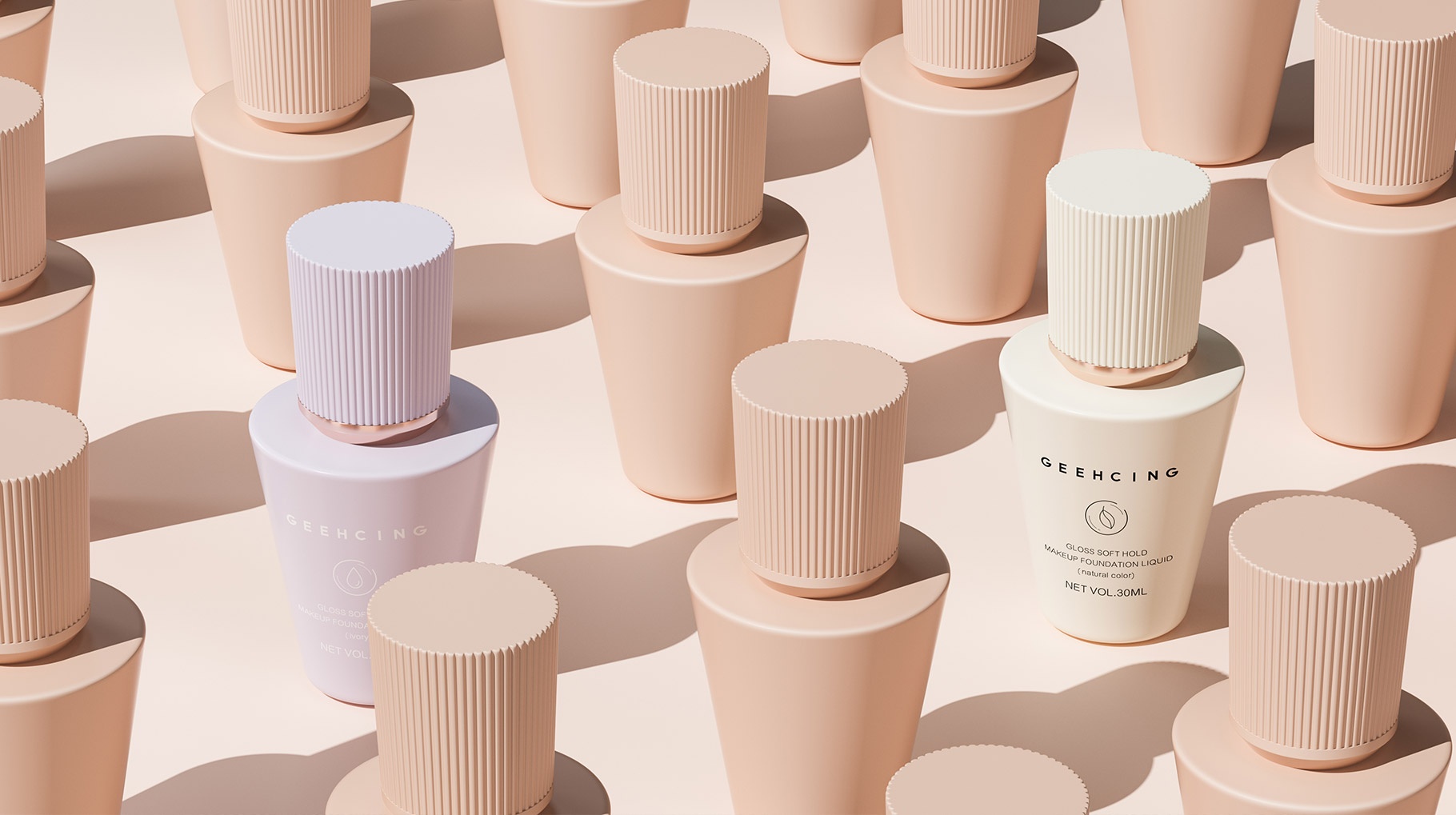 GEEHCING 化妆品产品造型设计简约、时尚、具有强烈的国际时尚品质,造型设计具有记忆特点,整体色彩视觉感官更加自然及舒适,整体产品包装设计让人具有较强的货架识别力及认知力。
