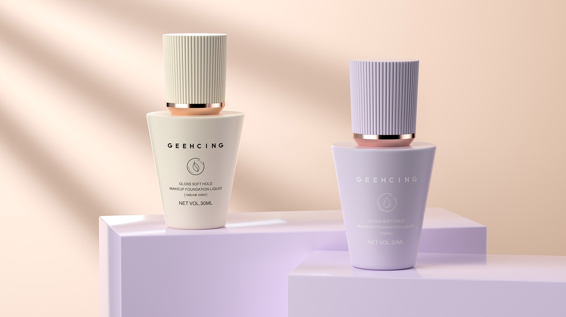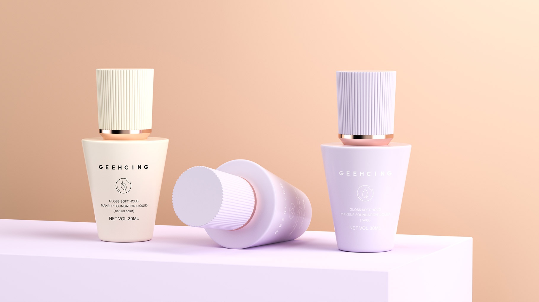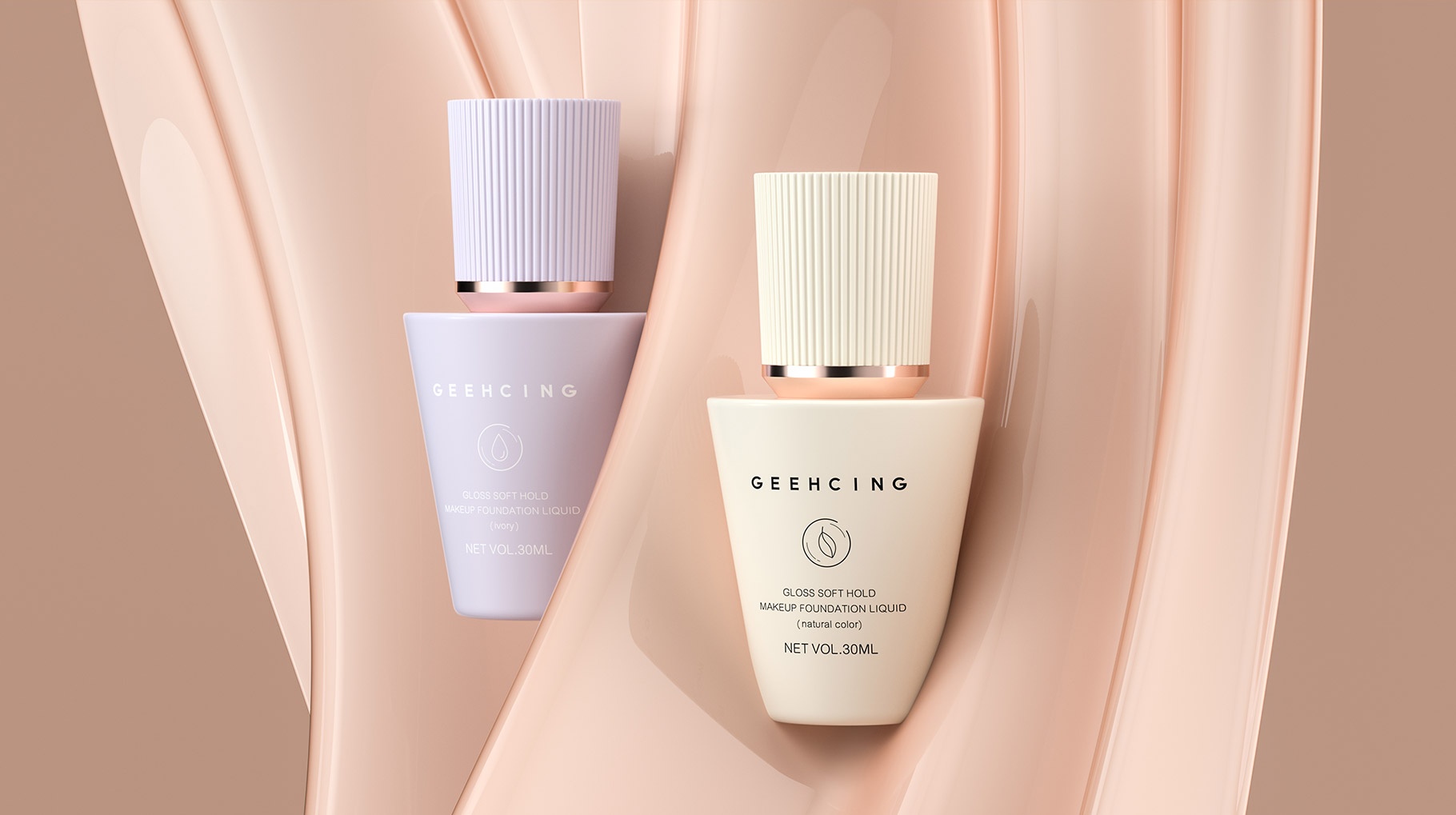GEEHCING 化妆品产品造型设计简约、时尚、具有强烈的国际时尚品质,造型设计具有记忆特点,整体色彩视觉感官更加自然及舒适,整体产品包装设计让人具有较强的货架识别力及认知力。