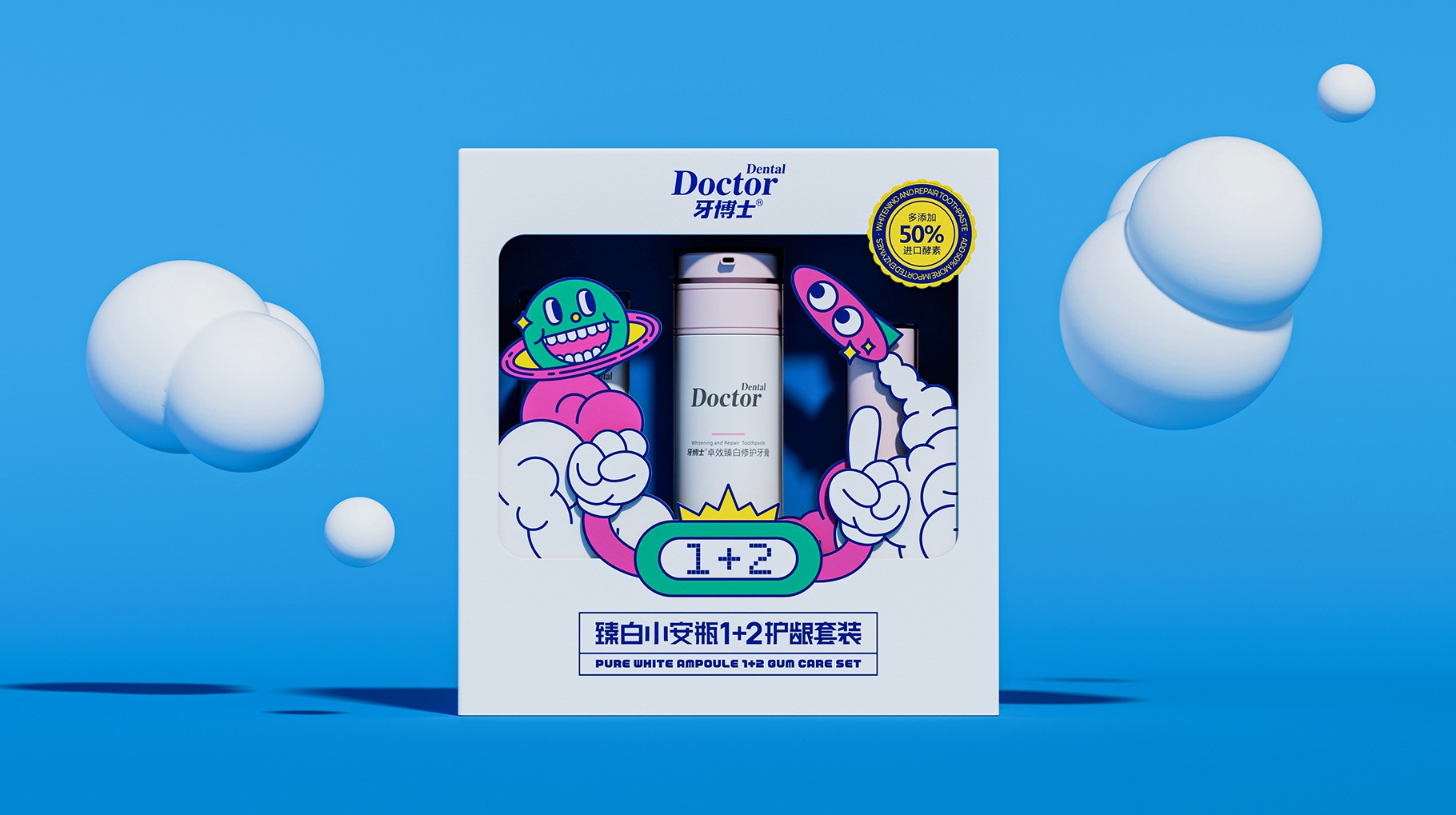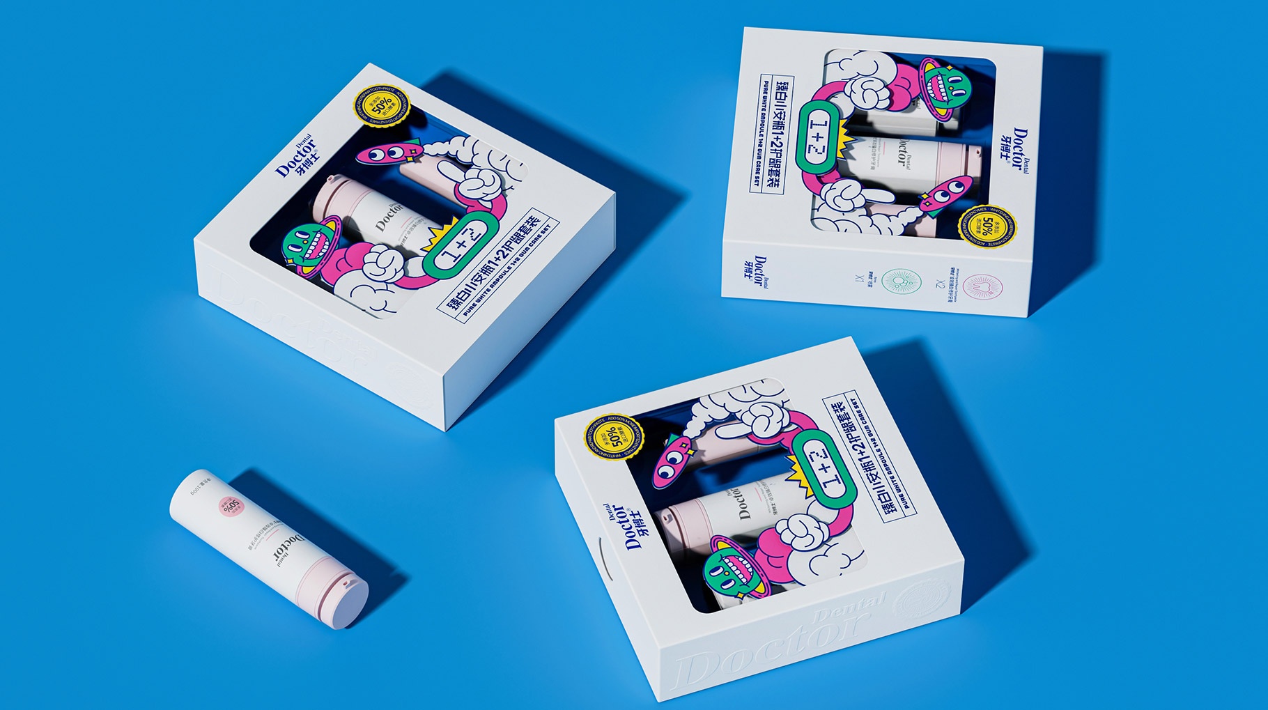 以有趣为内核,在包装设计中融入日常口腔洗护场景,牙膏的气泡、刷牙之后的清爽心情、拥有洁白牙齿的开心等这些熟悉的动作感受。从视觉设计延伸至对消费者的情绪设计。以清新的视觉色系作为整体包装的主色调,对比中兼有饱和度的融合。运用大胆、新颖、有趣、幽默、可爱的视觉符号,触动消费者使用产品场景的想象力。在符合产品的调性之下,不失活泼与活力。