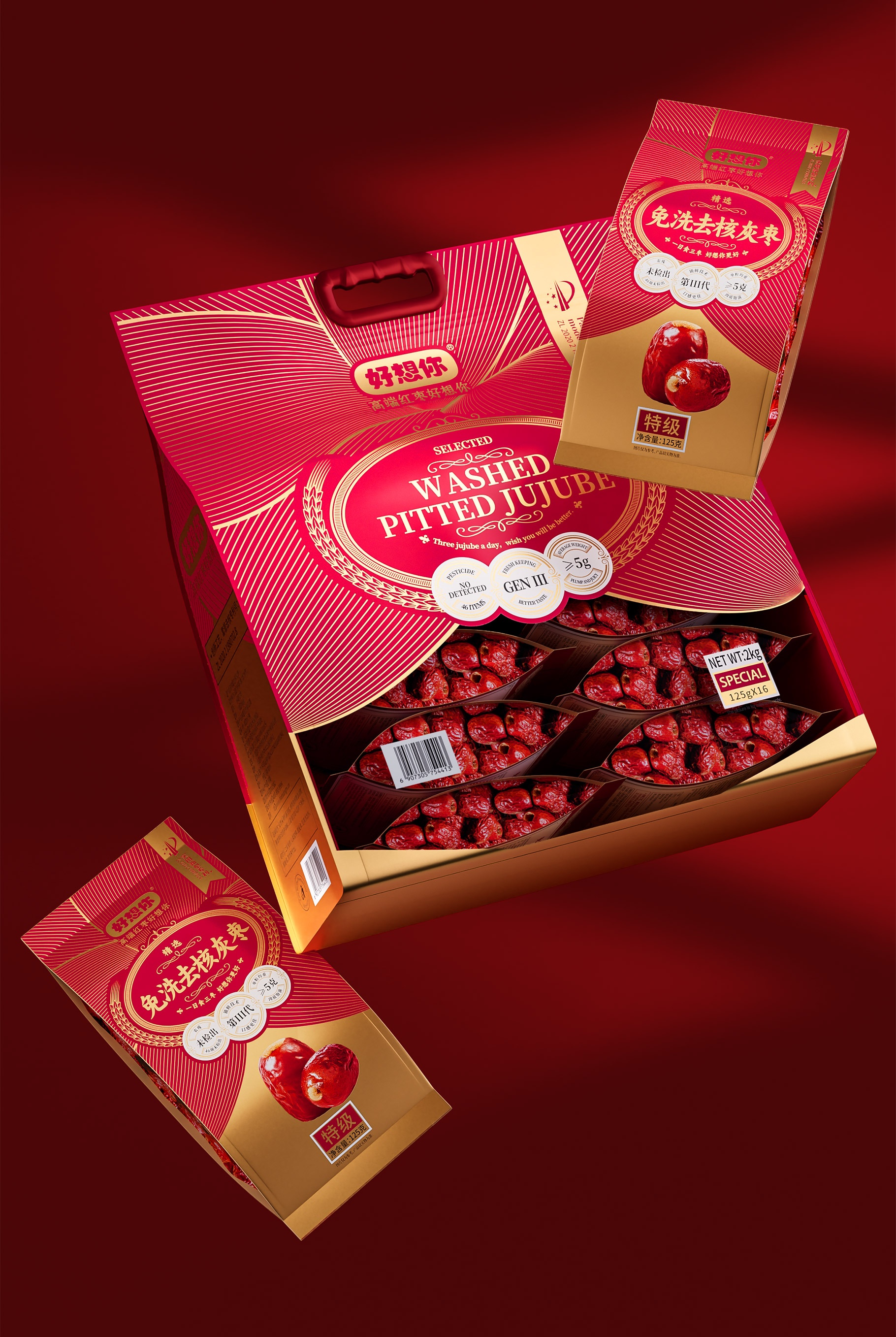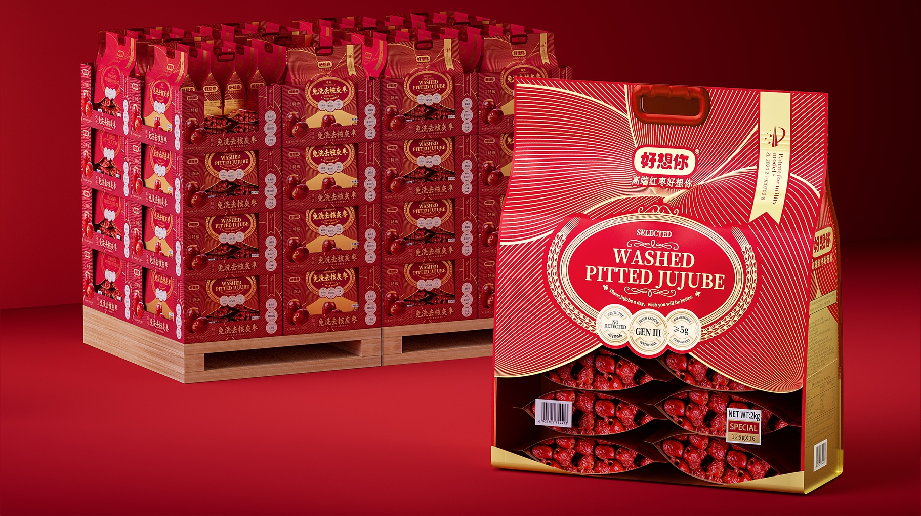 本次项目“好想你”与同道为山姆会员店渠道设计的一款精选去核免洗灰枣产品,整体产品包装设计以精致、现代的视觉符号设计表现形式,以绽放的花朵的纹样与大红枣图样的完美融合,呈现符合"好想你"红枣头部品牌的产品的牌认知度和独特性。