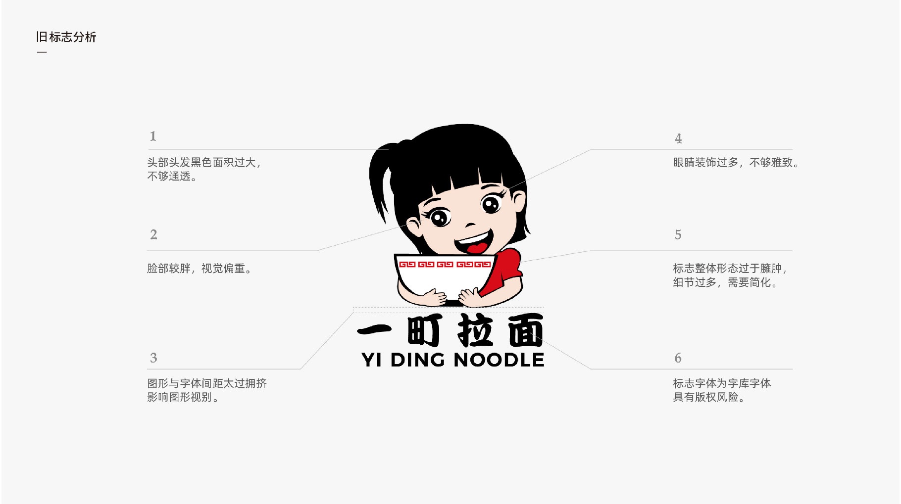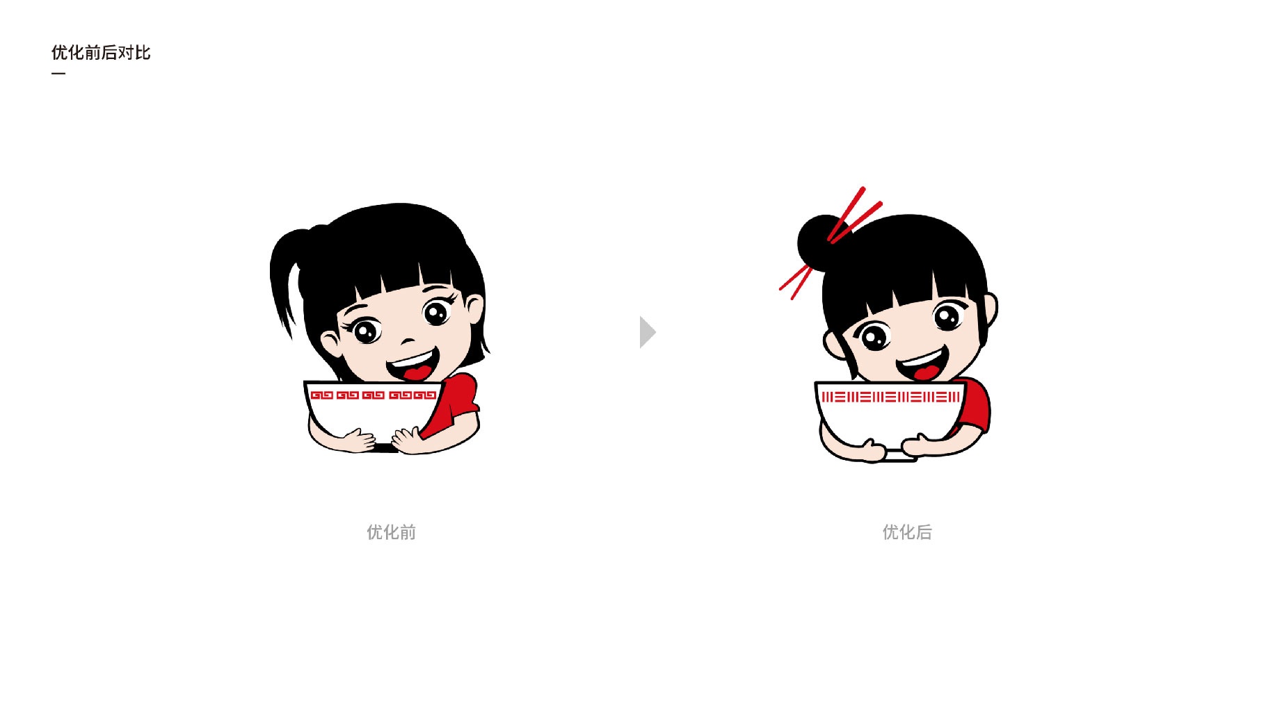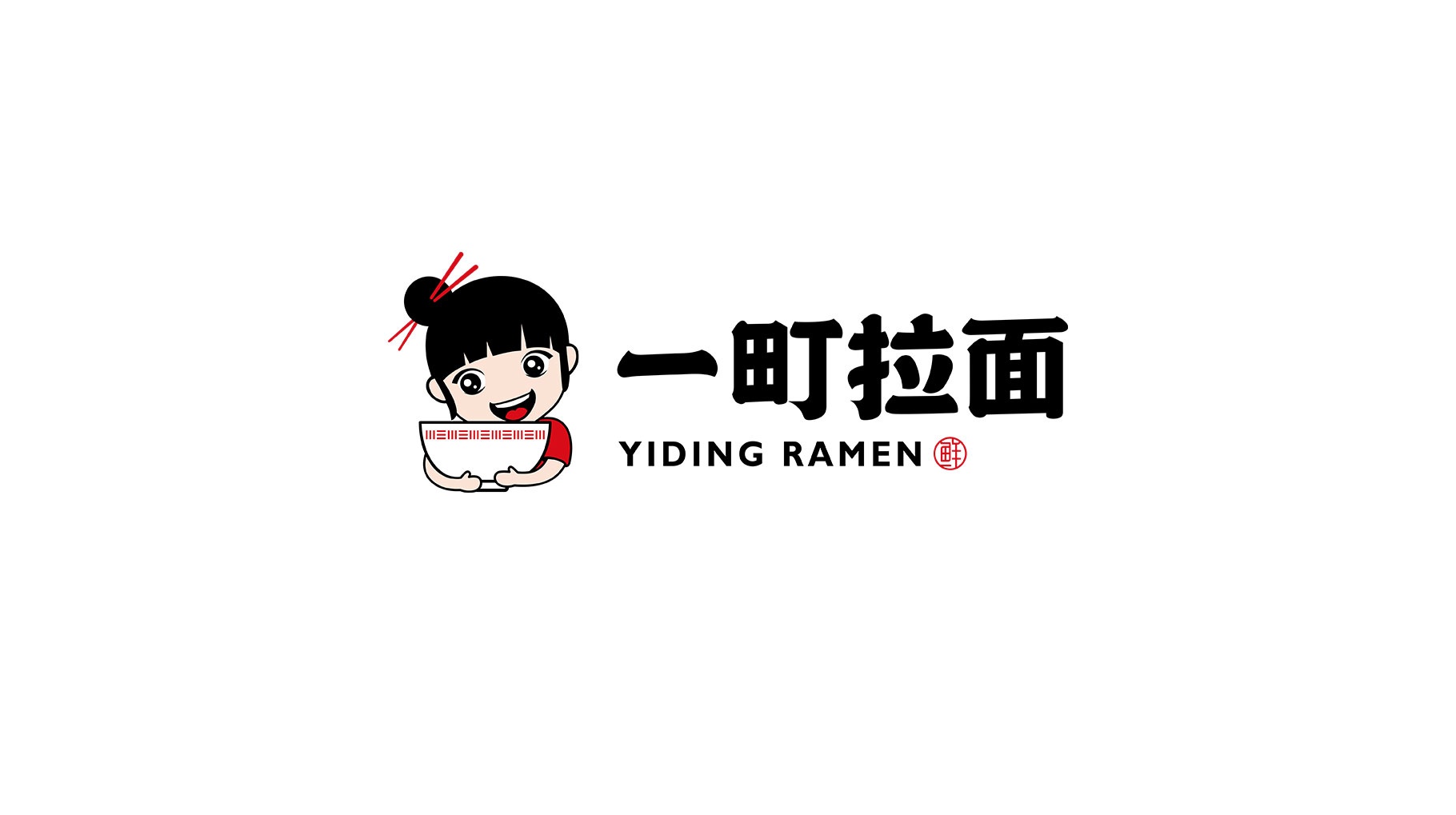 优化后:深化提炼强有力的品牌识别元素符号,避免与市场其它LOGO有雷同之处。大道至简,在原有图形的基础上做减法,在细节之处做加法。整体形象更具卡通感,时尚感。整体形象充满活力与元气、俏皮的特质,紧抓消费者眼球。细节之处,基于拉面与筷子的强链接关系,融入具有高度识别性的筷子作为LOGO中醒目独特的特点, 记忆点更强。