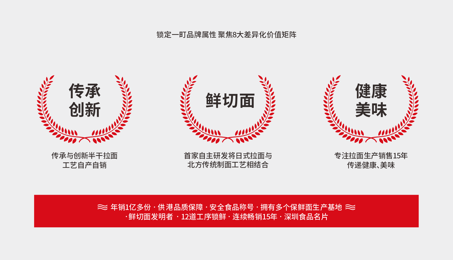 在市场竞争激烈的局势之下,线下市场没有明确的强势品牌及头目品牌,顾客心中没有首选的半干面品牌,对于半干面而言消费者最看重的核心点是:新鲜。与此同时“新鲜”也是一町与生俱来的品牌基因,作为拉面行业的创新者,一町发明了“鲜切面”产品,“保鲜面”作为一町的独特卖点极具差异化价值,将这一产品力聚焦,更需要占据品类第一,才能独享品类价值,成就大品牌,进而转化为强大的品牌势能。