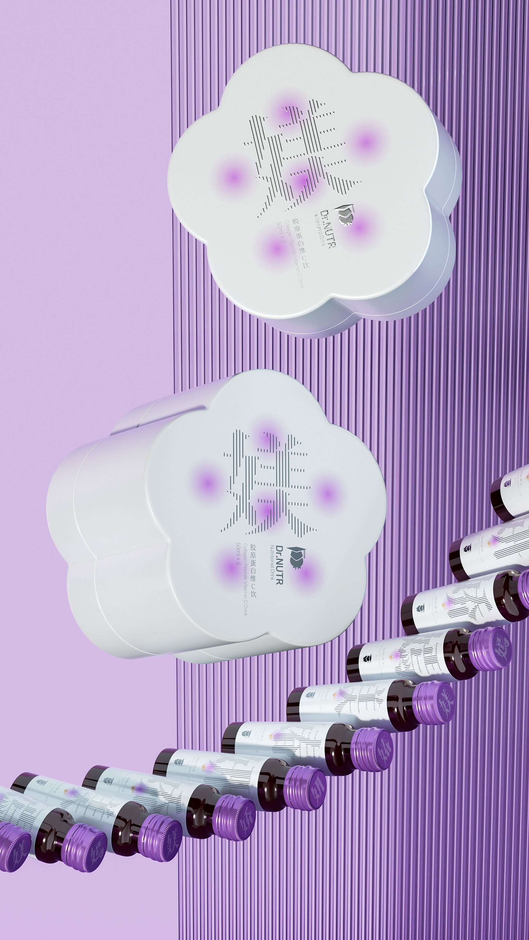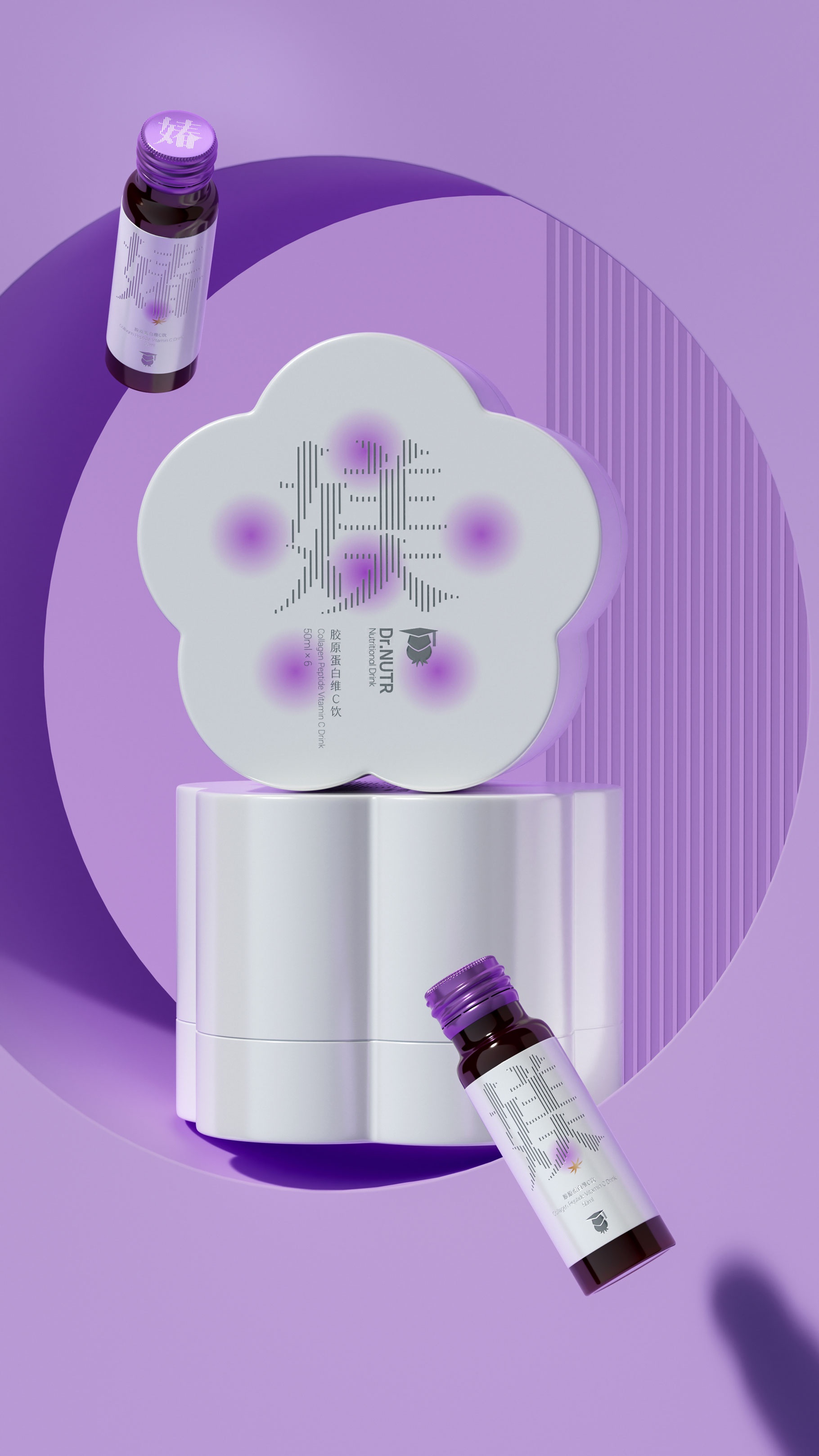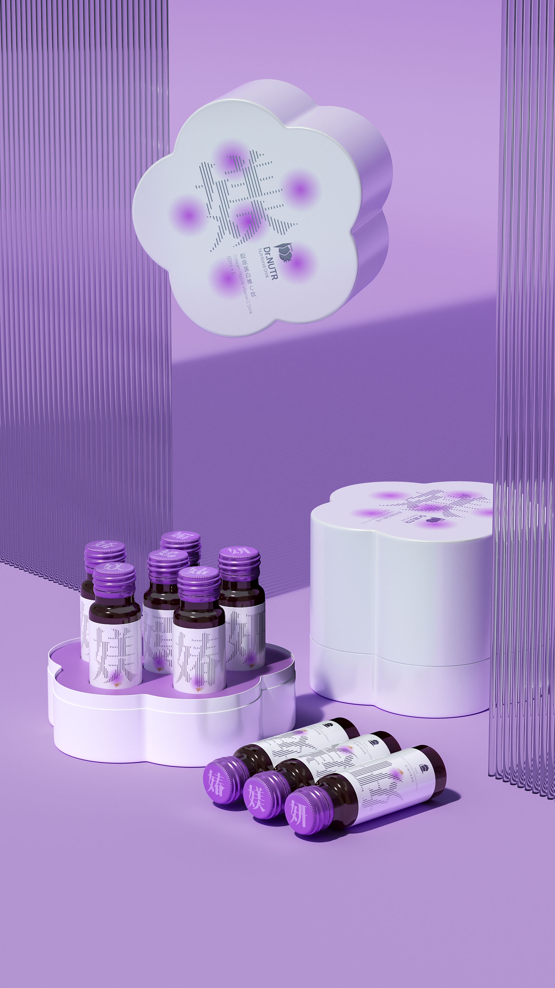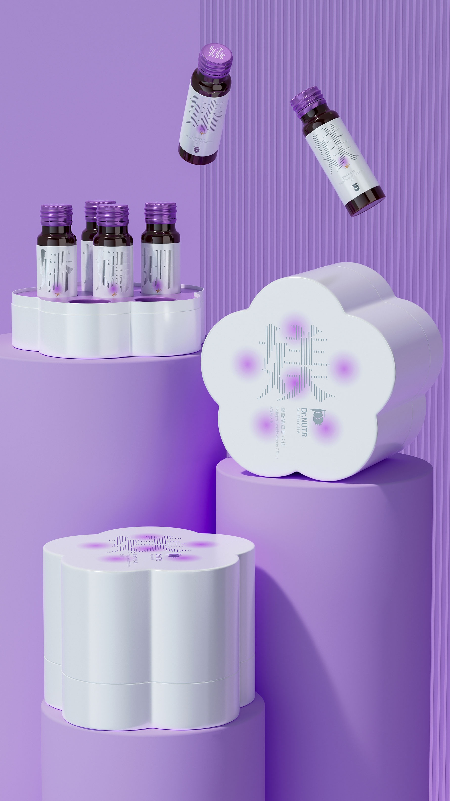 Dr.NUTE胶原蛋白维C饮是一款针对高端院线的滋补美容饮品。创思思考以“守护花期,定格多维之美”为核心理念,我们深入聚焦女性对于美丽与健康的深层诉求。产品的外包装设计汲取五瓣花的灵感,象征着女性如花般蓬勃的生命力,以及胶原蛋白对“花期永驻”的美好承诺。内盒则巧妙地通过六支口服液呼应“媄、媋、媚、娇、嫣、妍”六种女性美态,传递出“美无定式,自在新生”的品牌哲学。整体设计融合东方美学与现代极简语言,将功能消费升华为一场充满情感的仪式。