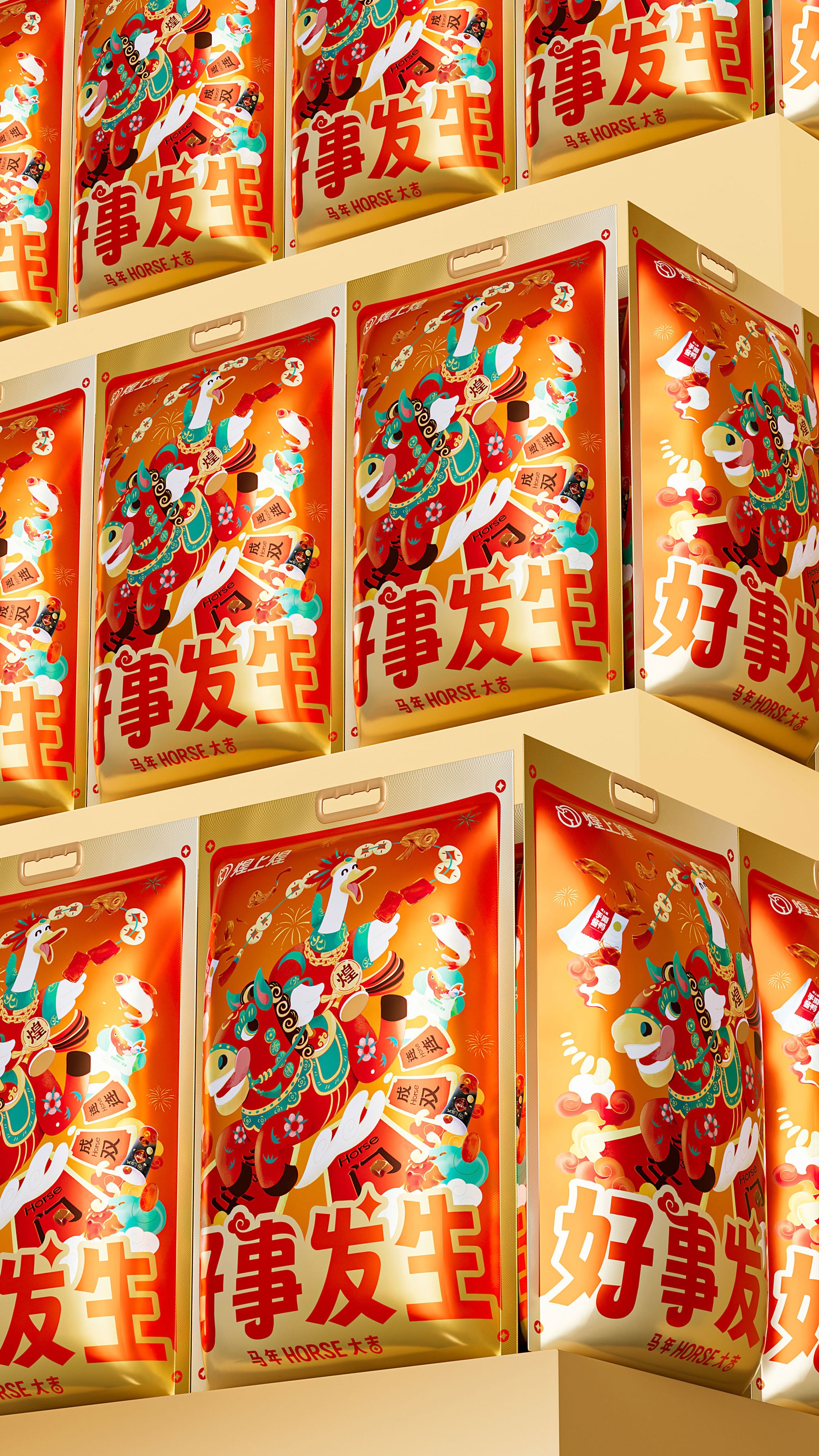 煌上煌「好事发生」新年大礼包的包装设计,巧妙地将传统文化与现代审美相结合,以独特的视觉语言诠释了年味与品牌精神,为消费者带来了一份充满祝福与好运的新年礼物。