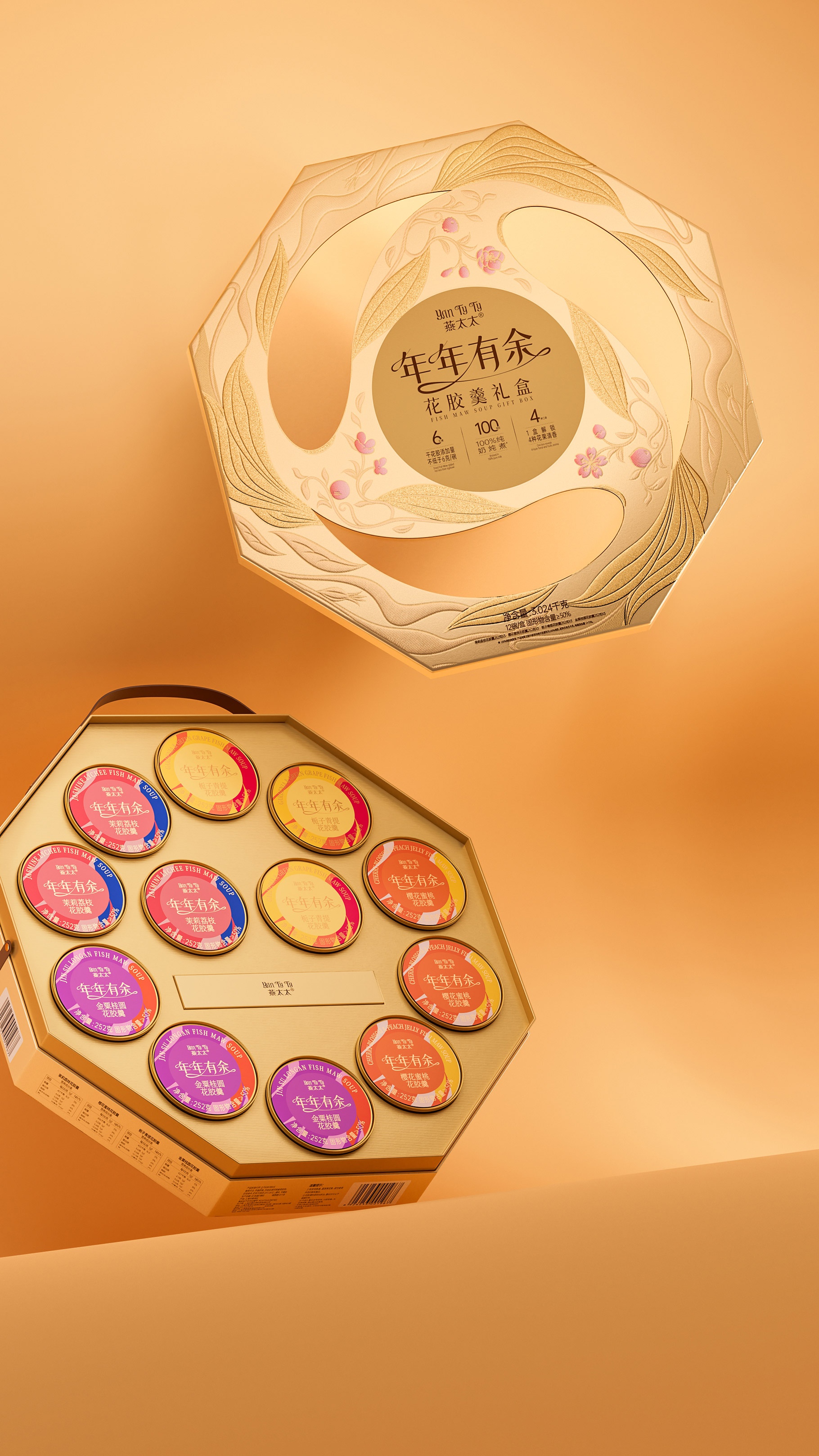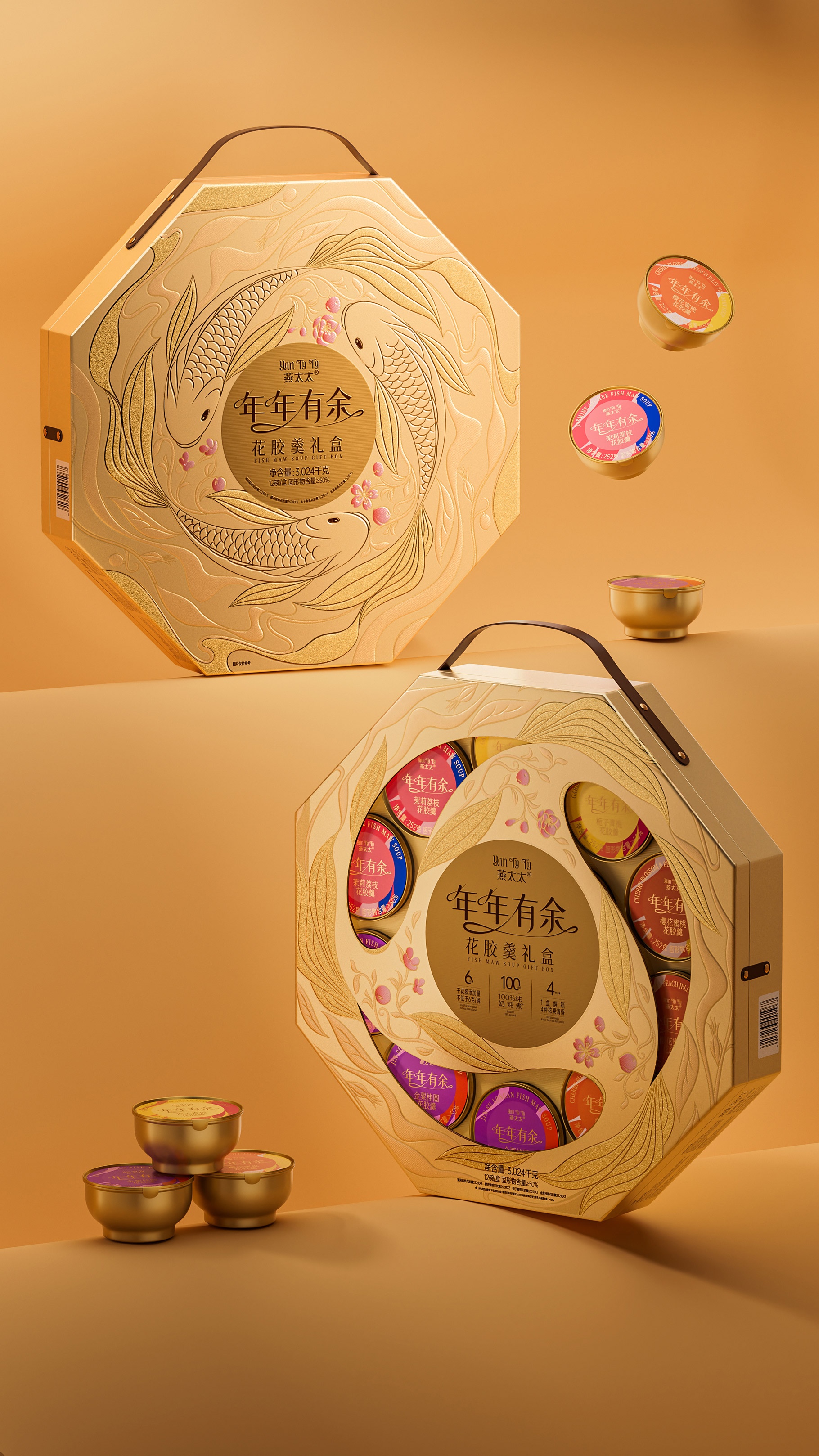 “年年有余”新年花胶羹礼盒包装设计,不仅是一款产品的包装,更是一件融合了传统文化与现代审美的视觉礼品。它承载着对新年的美好祝愿,以及对消费者生活品质的追求。这样一款设计独特、寓意深远的礼盒,定能为新年的庆祝增添一份特别的喜悦与温馨。