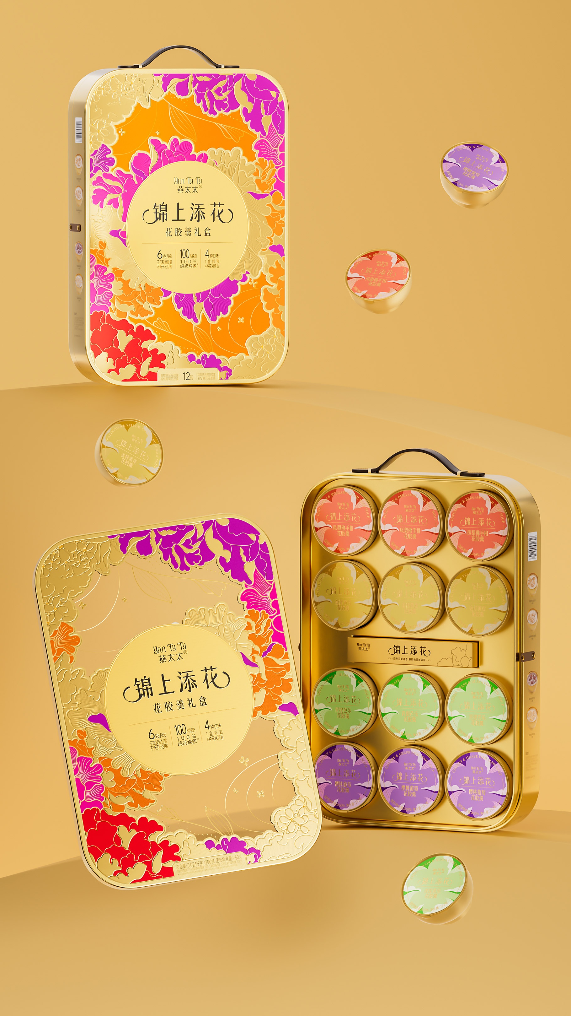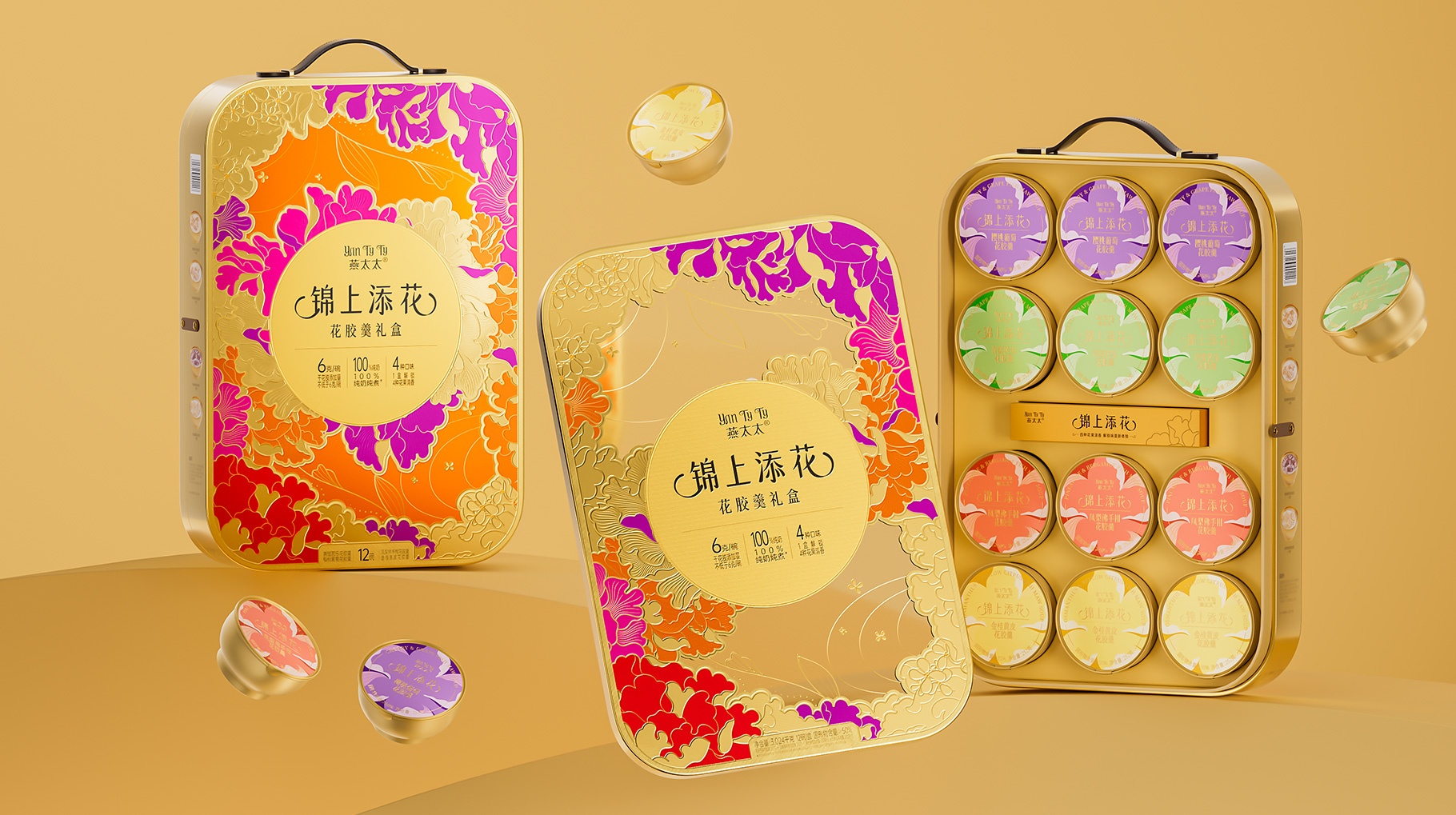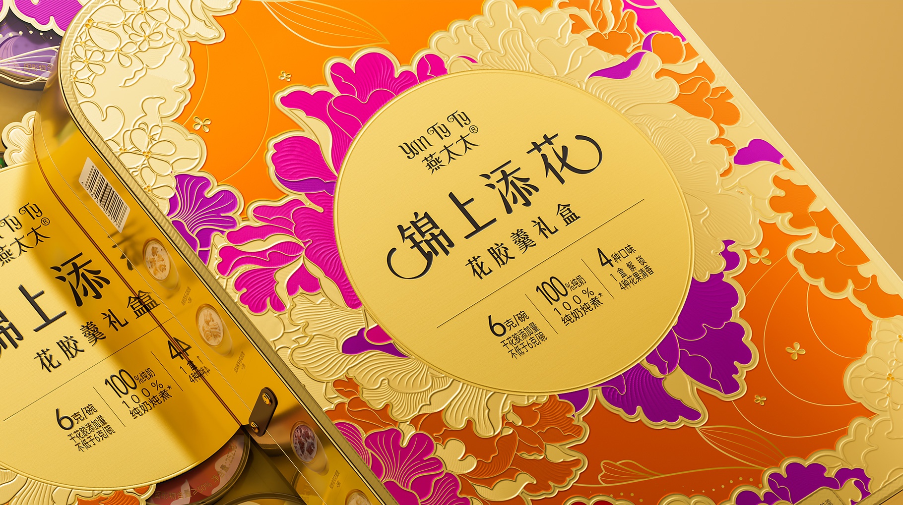 燕太太中秋花胶羹礼盒包装设计整体创以“多彩花朵绽放”为视觉基底,通过不同色彩的花型(如橙红、紫、粉等)呼应产品“4种花果口味”的差异化属性,让视觉符号与产品卖点深度契合;同时,正面开窗处隐约呈现“锦鲤”核心元素,以“虚实结合”的手法强化“吉祥寓意”(锦鲤象征富足),让传统吉祥文化与现代审美实现跨时空对话。