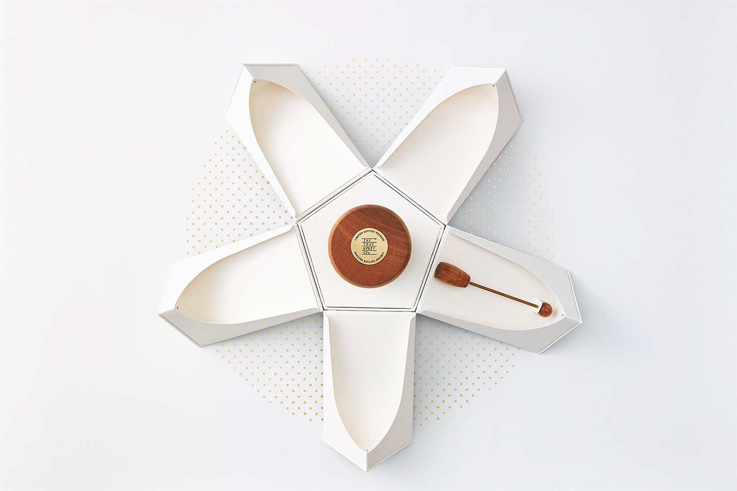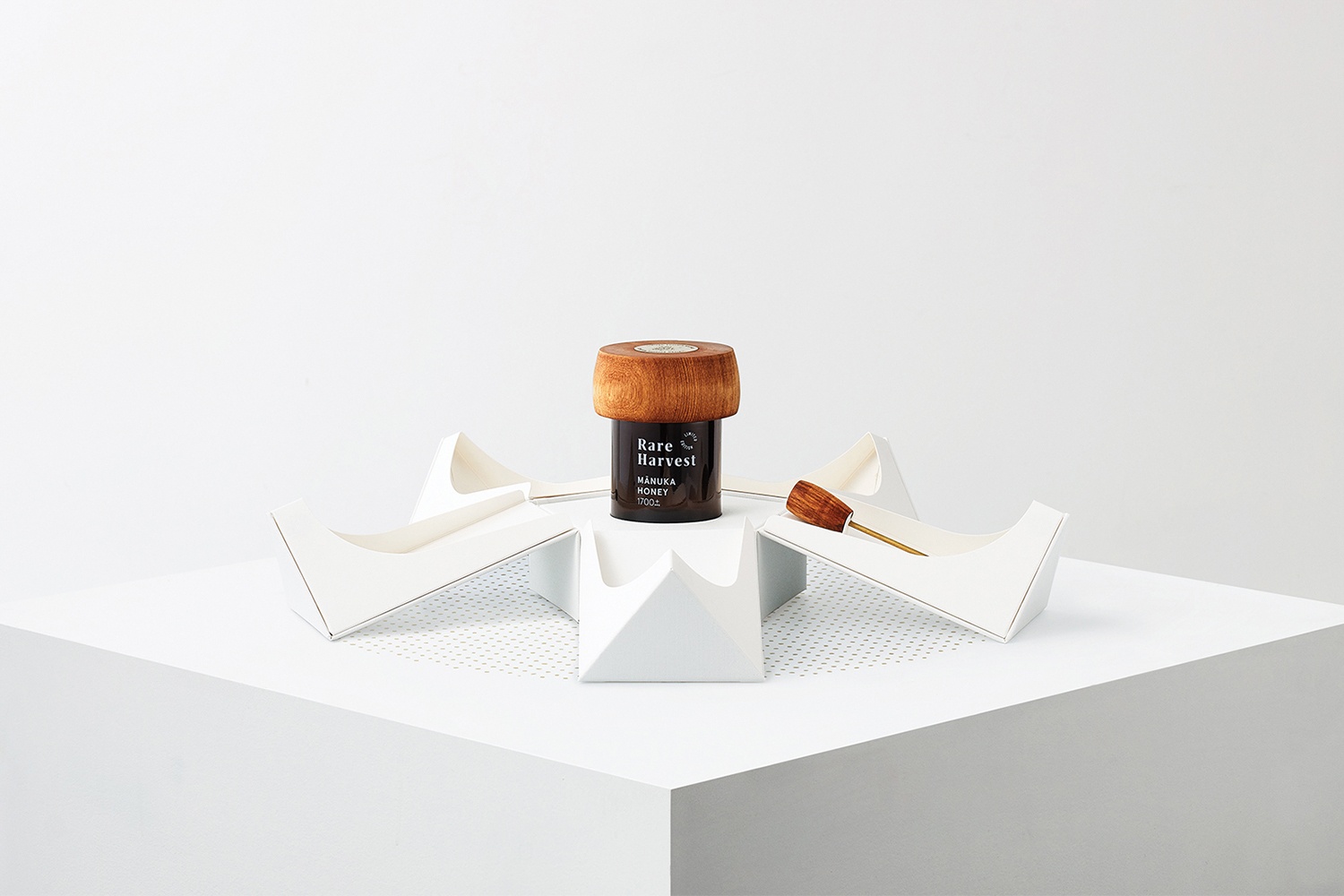 受Mānuka树的五瓣白花的启发,并与Think Packaging合作,Marx Design开发了一种新的结构,推进了以前系列的材料语言。这持有一个独特的蜂蜜罐,其特点是用可持续采购的心形rimu制作的手工翻盖,以及一个定制的蜂蜜滴漏器。